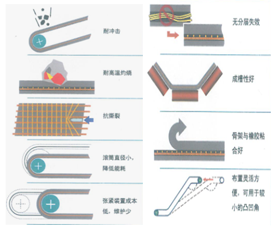 IW/SW-HE型鋼(gang)簾(lian)網(wang)輸(shu)送(song)帶,是采(cai)(cai)用鋼(gang)質材料,由經向(xiang)鋼(gang)絲繩(sheng)和(he)緯向(xiang)鋼(gang)絲簾(lian)線編織(zhi)而成網(wang)狀結(jie)構(gou)輸(shu)送(song)帶。經向(xiang)鋼(gang)絲繩(sheng)和(he)緯向(xiang)編織(zhi)的鋼(gang)絲簾(lian)線保持平(ping)直,緯向(xiang)鋼(gang)絲簾(lian)線始終在經向(xiang)鋼(gang)絲繩(sheng)上方。經向(xiang)鋼(gang)絲繩(sheng)經過特(te)殊捻制,采(cai)(cai)用通透式(shi)特(te)殊結(jie)構(gou),具(ju)有更好的滲膠(jiao)性能(neng)。緯向(xiang)鋼(gang)絲簾(lian)線采(cai)(cai)用髙伸長鋼(gang)絲簾(lian)線,可以保證輸(shu)送(song)帶的橫(heng)向(xiang)撓度和(he)成槽性能(neng)。IW/SW-HE型鋼(gang)簾(lian)網(wang)輸(shu)送(song)帶經向(xiang)強度為350~1600kN . m-1,適用于中(zhong)等強度要(yao)求(qiu)的場合。可廣(guang)泛應用于礦石(shi)(shi)裝卸、冶金燒結(jie)廠、焦炭廠、水泥(ni)廠提升帶、采(cai)(cai)石(shi)(shi)廠、斗(dou)輪裝卸、拐彎(wan)半徑較小(xiao)的場合。IW/SW-HE型鋼(gang)簾(lian)網(wang)輸(shu)送(song)帶的特(te)殊結(jie)構(gou),可賦予輸(shu)送(song)帶卓越的抗(kang)(kang)沖擊性能(neng)和(he)抗(kang)(kang)撕裂性能(neng),是一種具(ju)有良好發(fa)展前(qian)途的輸(shu)送(song)帶新品種。